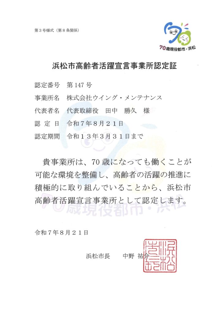 貴事業所は、70歳になっても働くことが可能な環境を整備し、高齢者の活躍の推進に積極的に取り組んでいることから、浜松市高齢者活躍宣言事業所として認定します。(浜松市認定 令和7年8月21日)