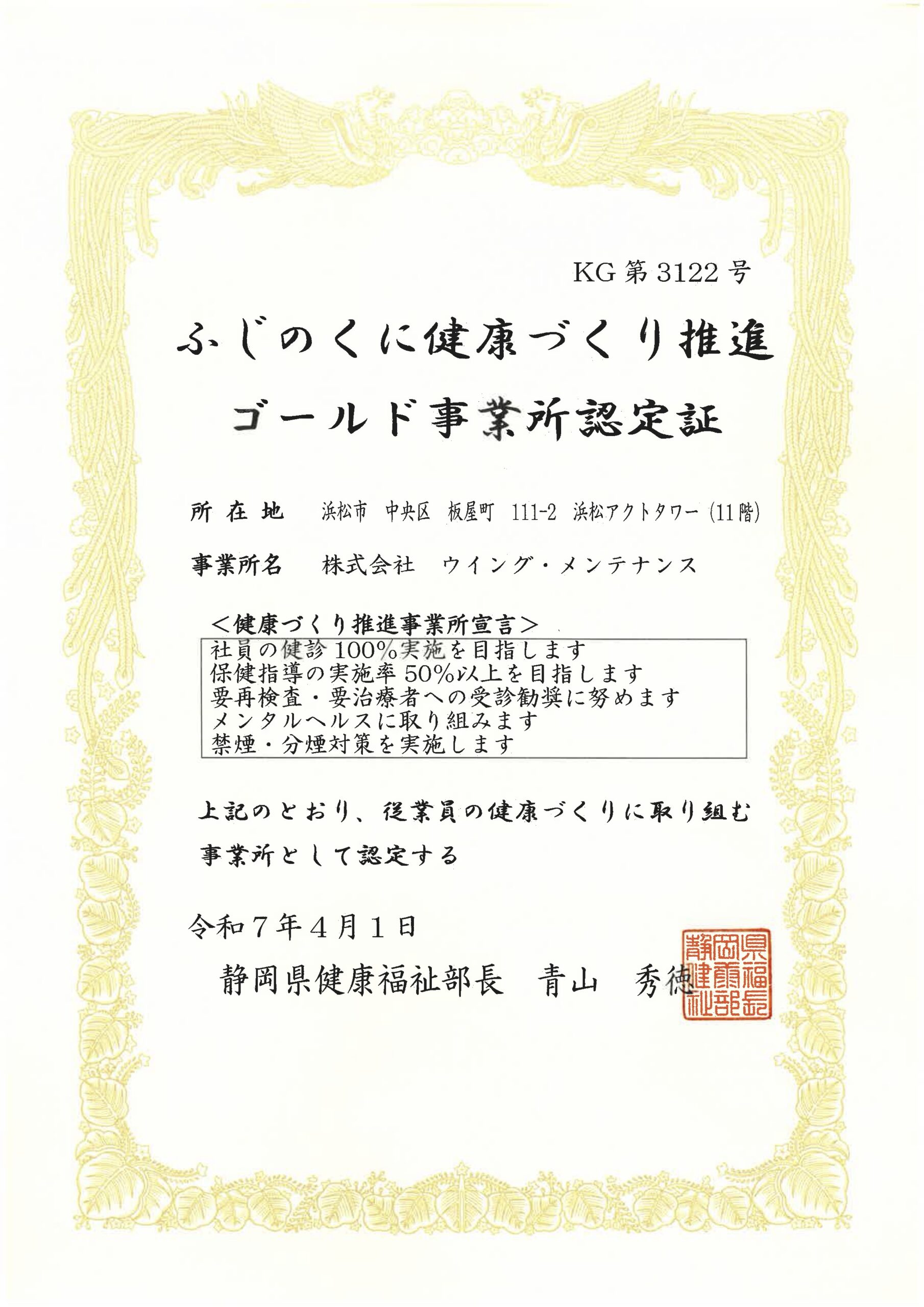 株式会社ウイング・メンテナンスは静岡県の「ふじのくに健康づくり推進事業所認定制度」で最高位のゴールド認定を取得しました。社員の健康診断100%実施など、働く私たち自身が健康であることを大切に想い、継続してきたことが形になりました。